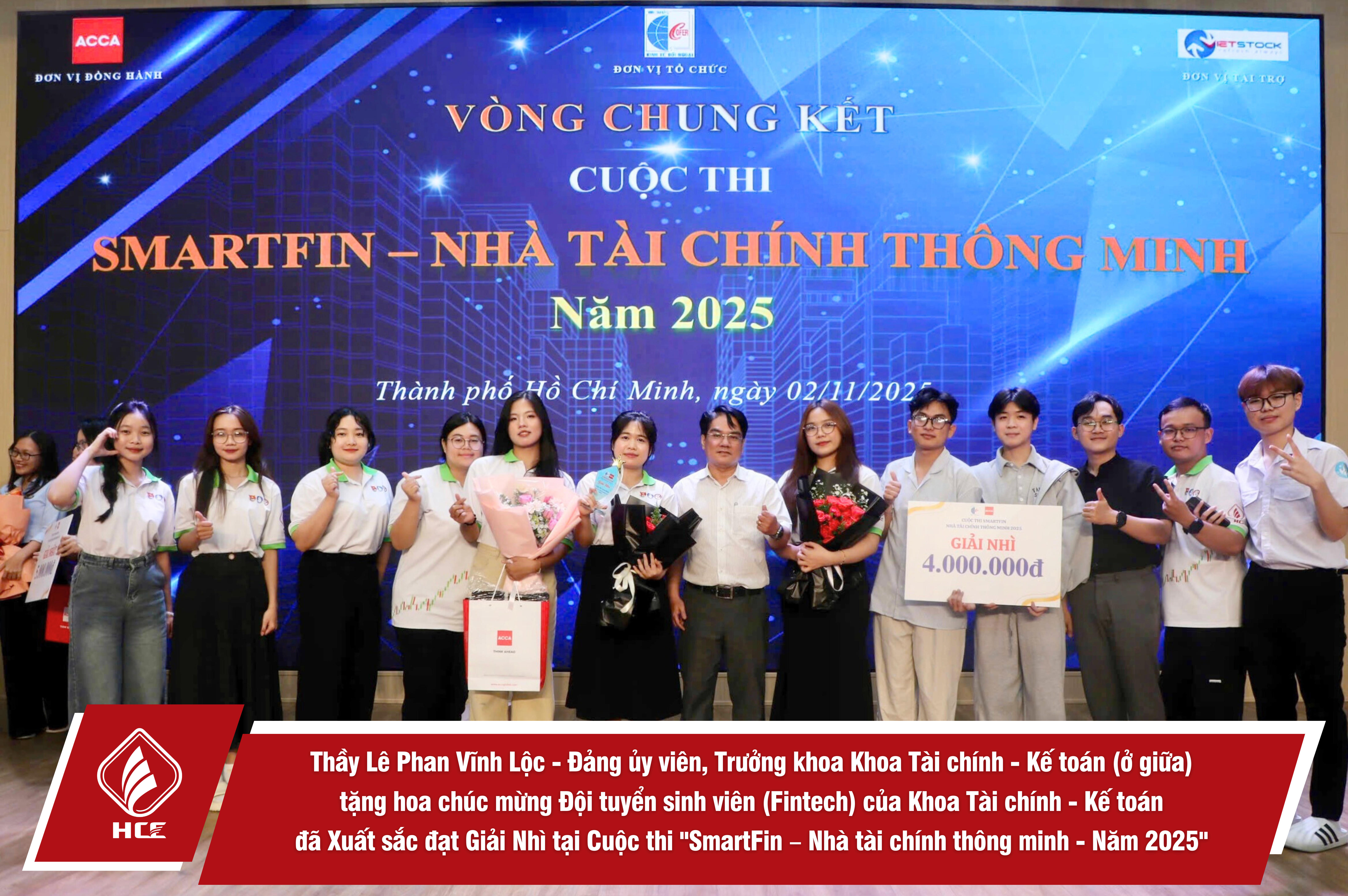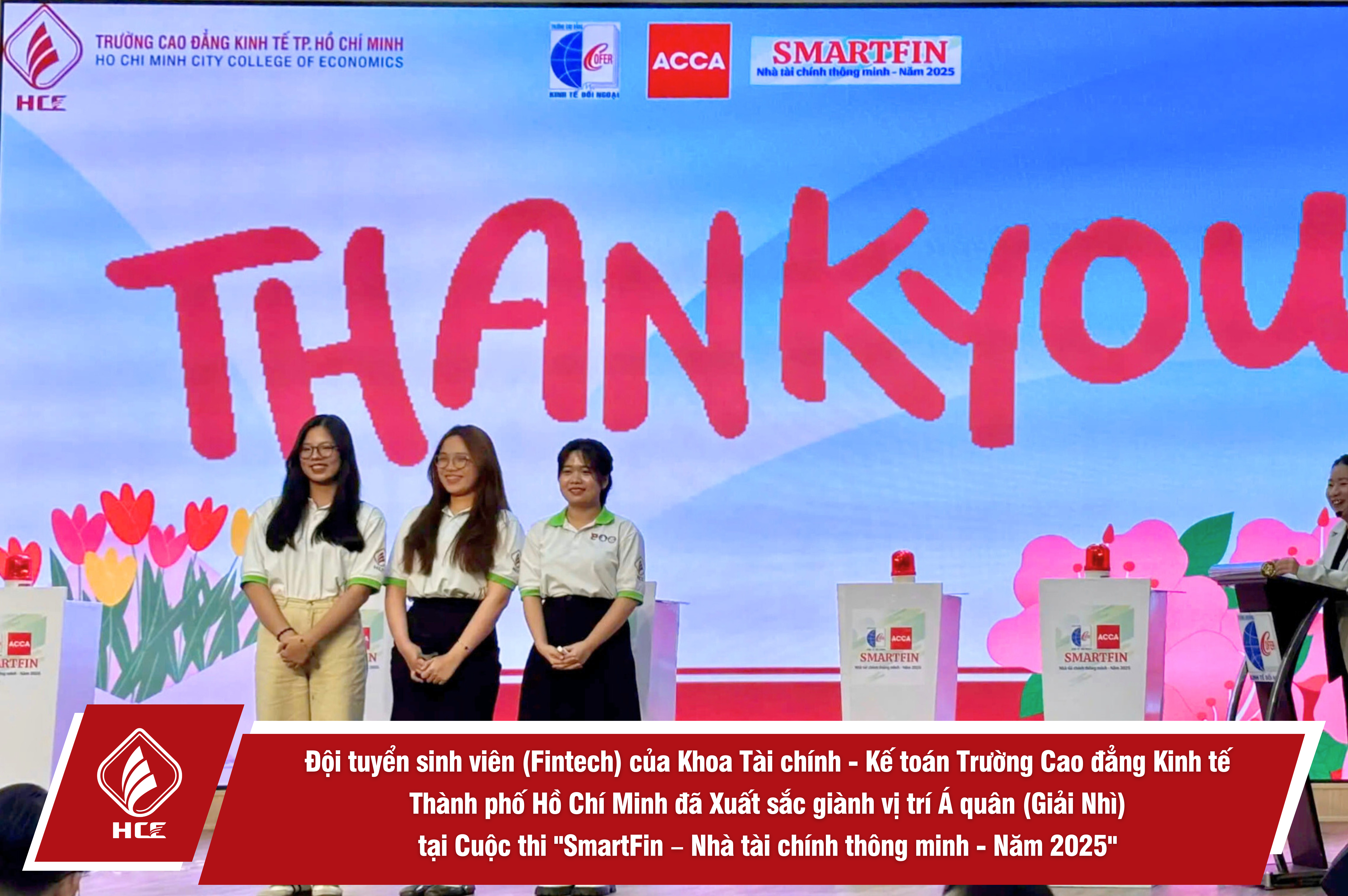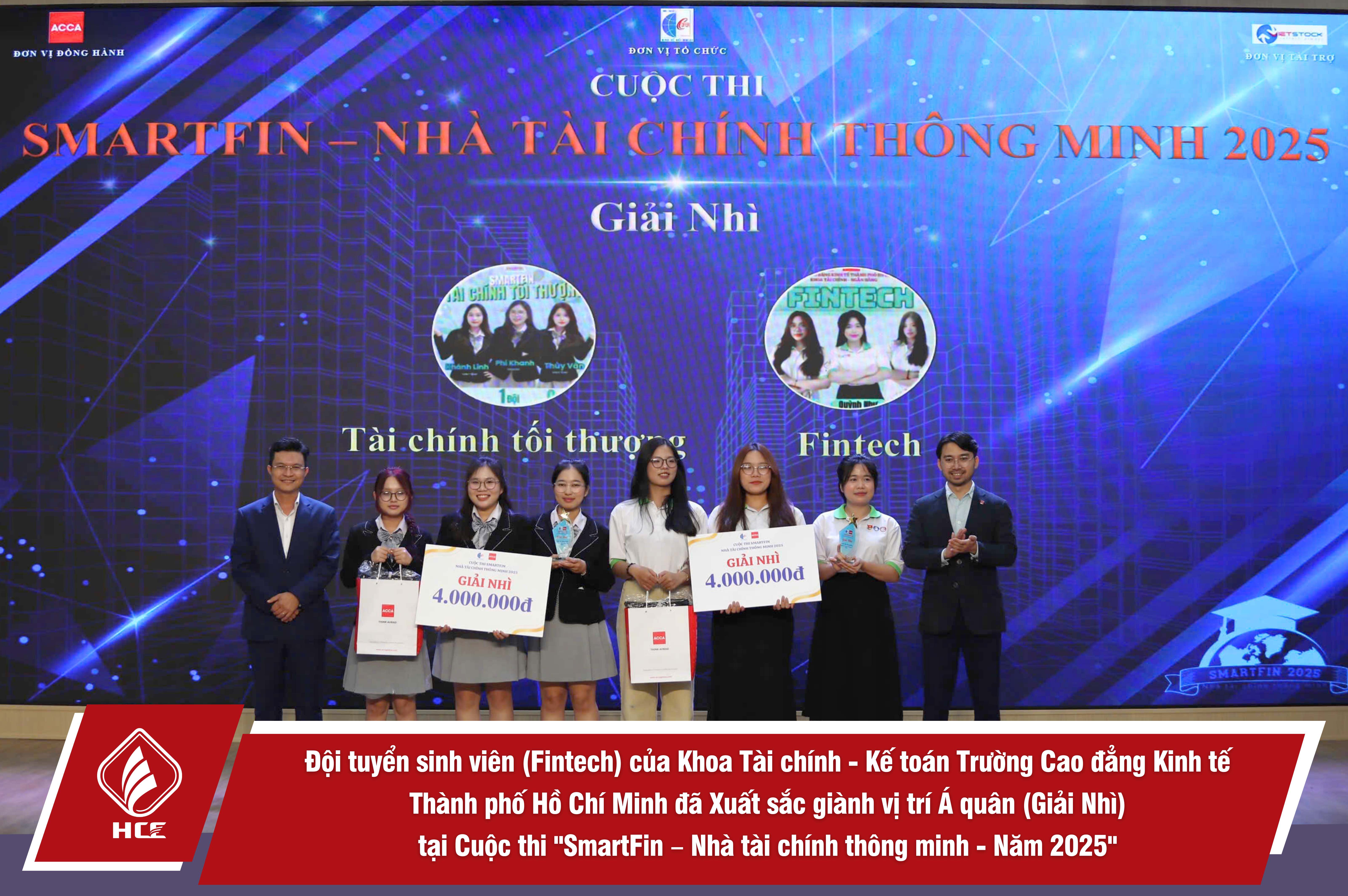Khoa Tài chính – Kế toán, Trường Cao đẳng Kinh tế Thành phố Hồ Chí Minh (HCE) chúc mừng đội tuyển sinh viên (Fintech) của Khoa đã xuất sắc giành vị trí Á quân (Giải Nhì) tại Cuộc thi “SmartFin – Nhà tài chính thông minh – Năm 2025”.