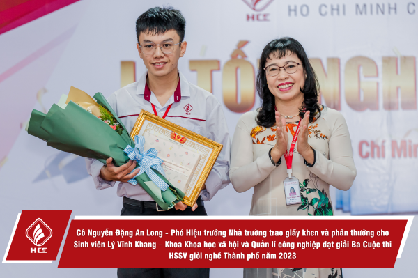 Trong dịp này, Nhà trường tổ chức khen thưởng cho sinh viên Lý Vĩnh Khang – Khoa Khoa học xã hội và Quản lí công nghiệp và sinh viên Trần Cẩm Hòa – Khoa Công nghệ thông tin. Các bạn đã đạt giải Ba trong cuộc thi Học sinh – Sinh viên giỏi nghề Thành phố năm 2023, nghề Hướng dẫn du lịch và nghề Thiết kế website. Các sinh viên có thành tích tiêu biểu (tốt nghiệp loại xuất sắc và giỏi) cũng được Nhà trường trao tặng giấy khen và phần thưởng khuyến khích.