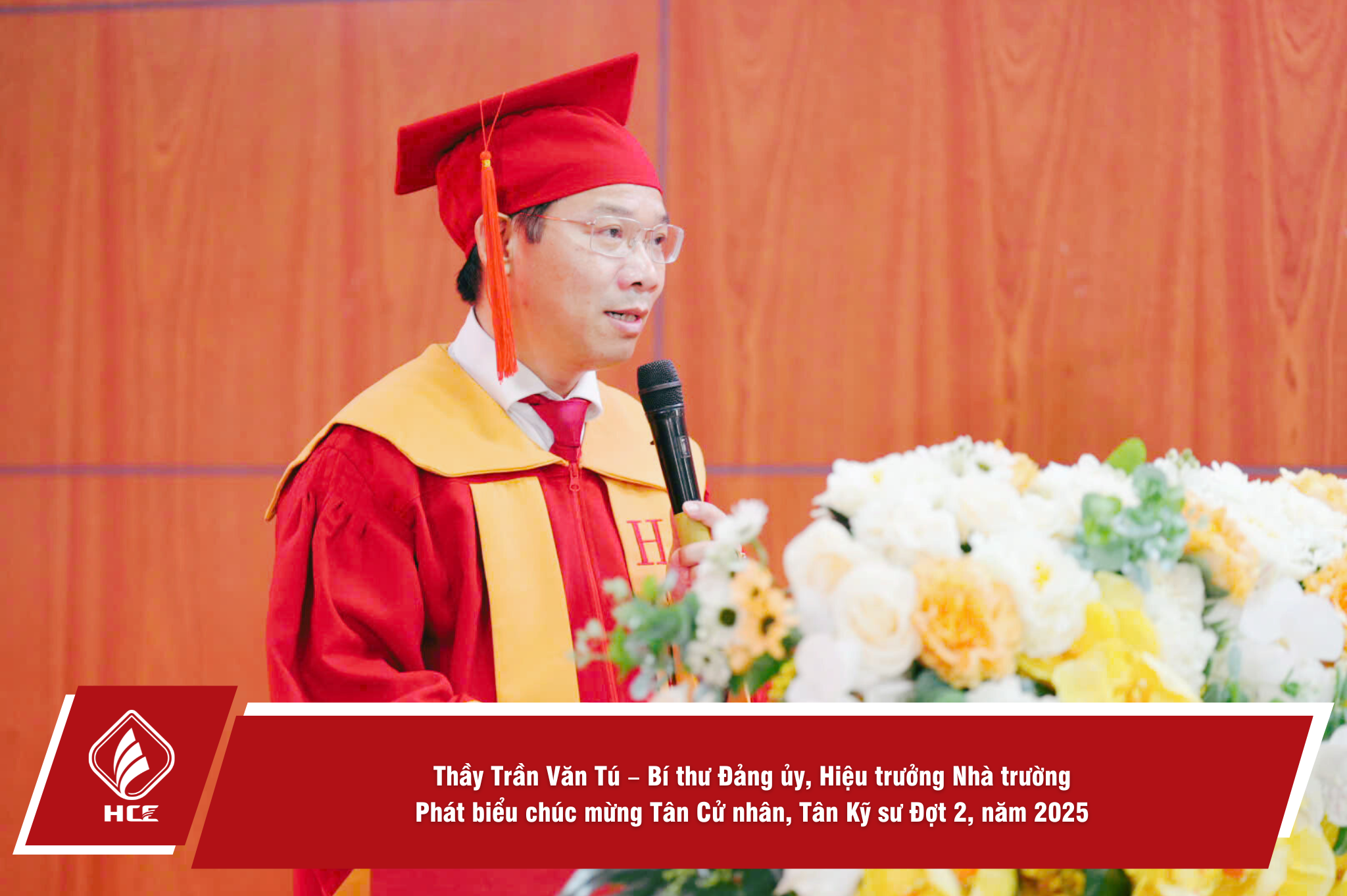 Về phía Nhà trường, tham dự và trao bằng Tốt nghiệp cho sinh viên có Thầy Trần Văn Tú – Bí thư Đảng ủy, Hiệu trưởng Nhà trường; Thầy Phạm Hùng Dũng – Phó Bí thư Đảng ủy, Phó Hiệu trưởng Nhà trường; Cô Võ Thị Khánh Vân – Đảng uỷ viên, Phó Hiệu trưởng Nhà trường; Cô Nguyễn Đặng An Long – Đảng uỷ viên, Phó Hiệu trưởng Nhà trường. Các thầy, cô Trưởng, Phó các đơn vị, giảng viên, nhân viên là cố vấn học tập cùng tham dự và chúc mừng cho các Tân Cử nhân, Tân Kỹ sư Đợt 2 năm 2025.