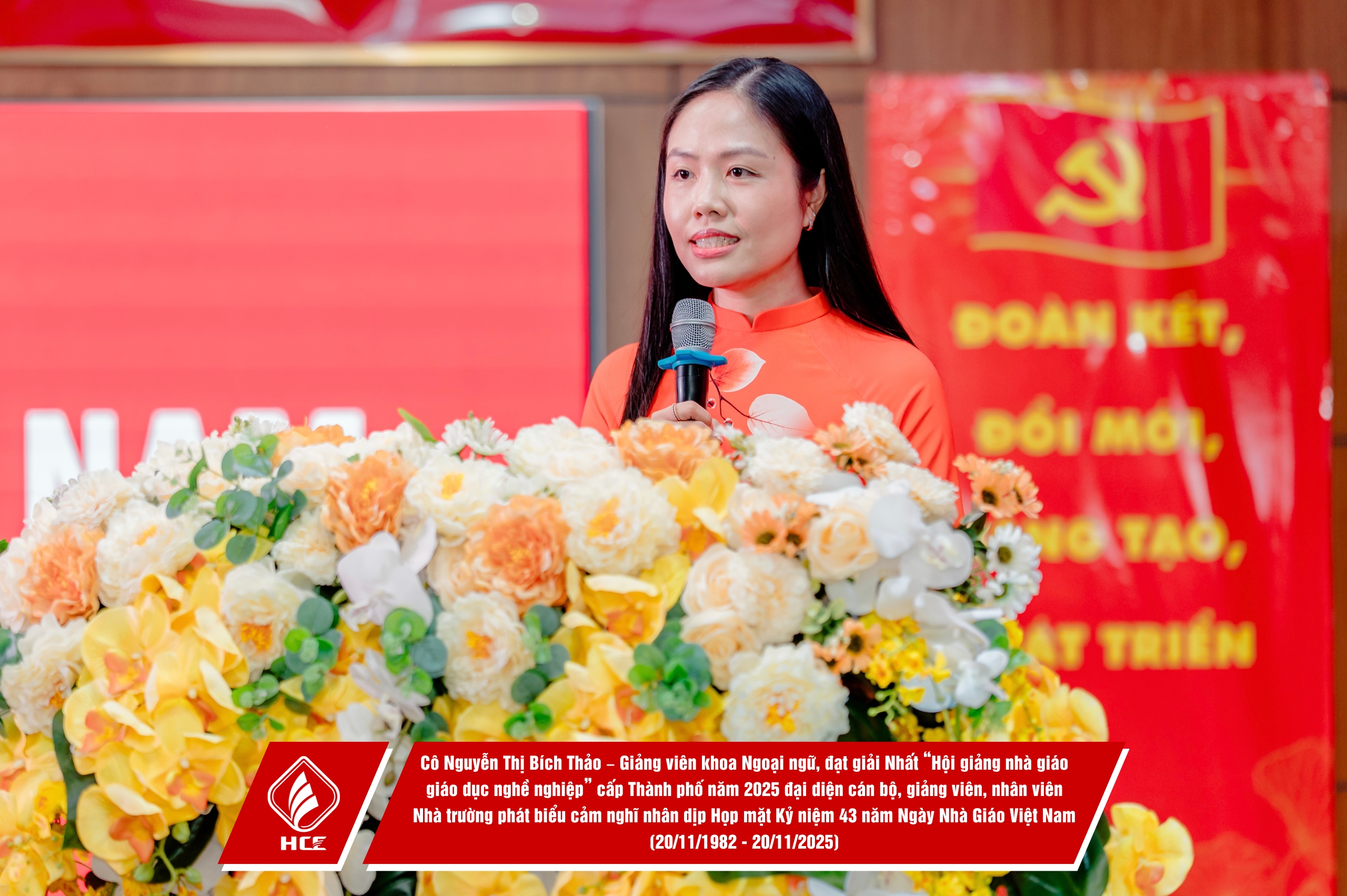 – Phát biểu chúc mừng của đại diện lãnh đạo địa phương; Phát biểu chúc mừng của thầy Trần Văn Tú – Bí thư Đảng bộ, Hiệu trưởng Nhà trường; Phát biểu cảm nghĩ của cô Nguyễn Thị Bích Thảo – Giảng viên Khoa Ngoại ngữ, Giải Nhất “Hội giảng nhà giáo giáo dục nghề nghiệp” cấp thành phố năm 2025 đại diện cán bộ, giảng viên, viên chức Nhà trường; Phát biểu tri ân của thế hệ tuổi trẻ Sinh viên HCE và tặng hoa chúc mừng quý thầy, cô.