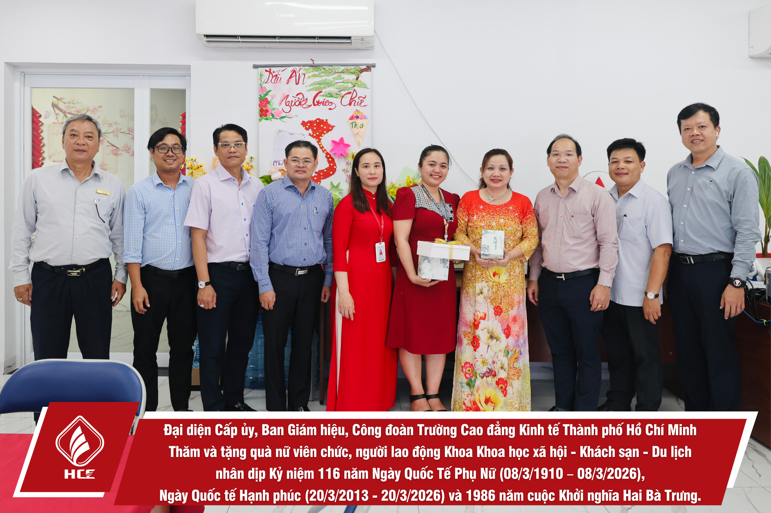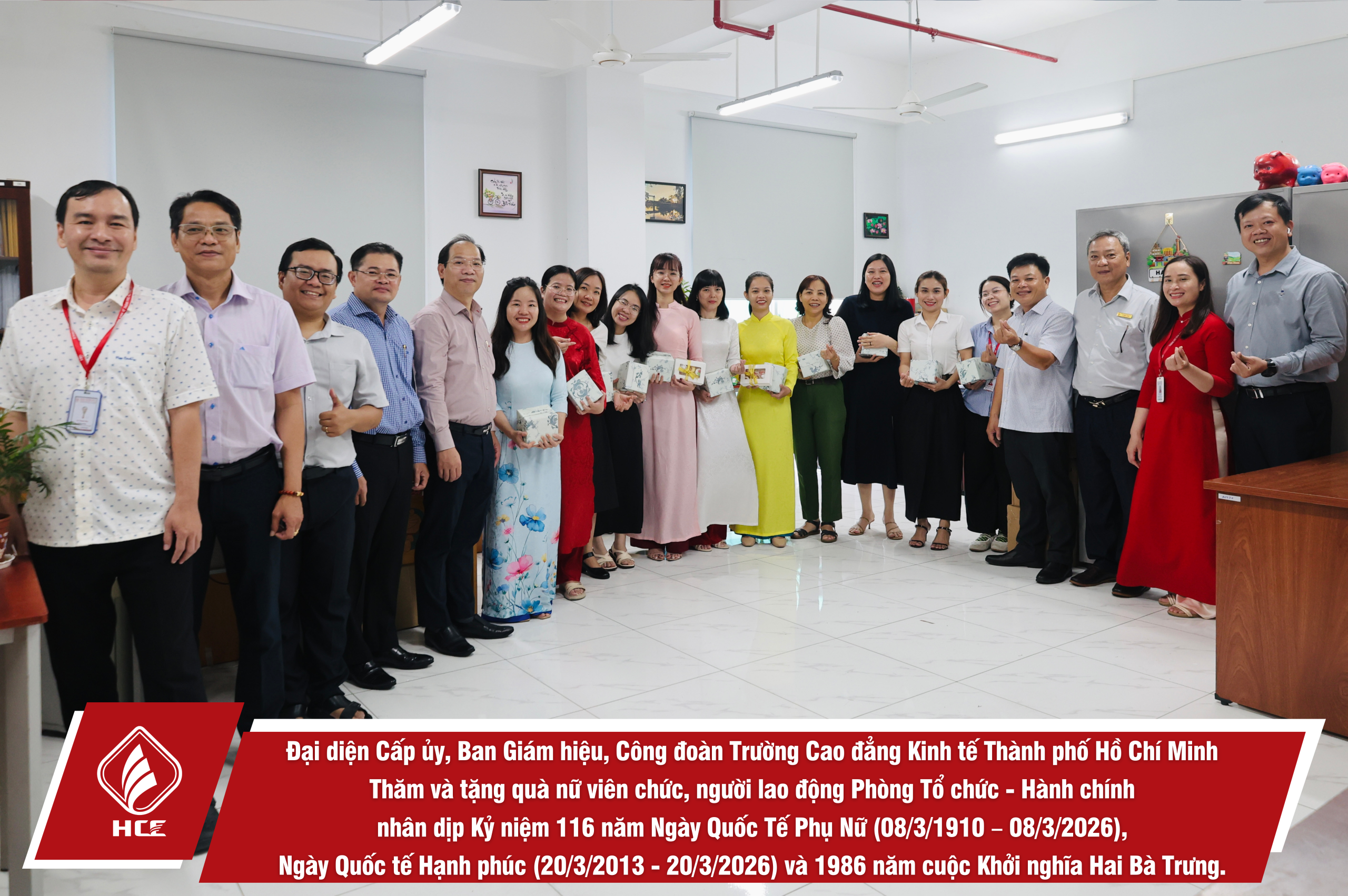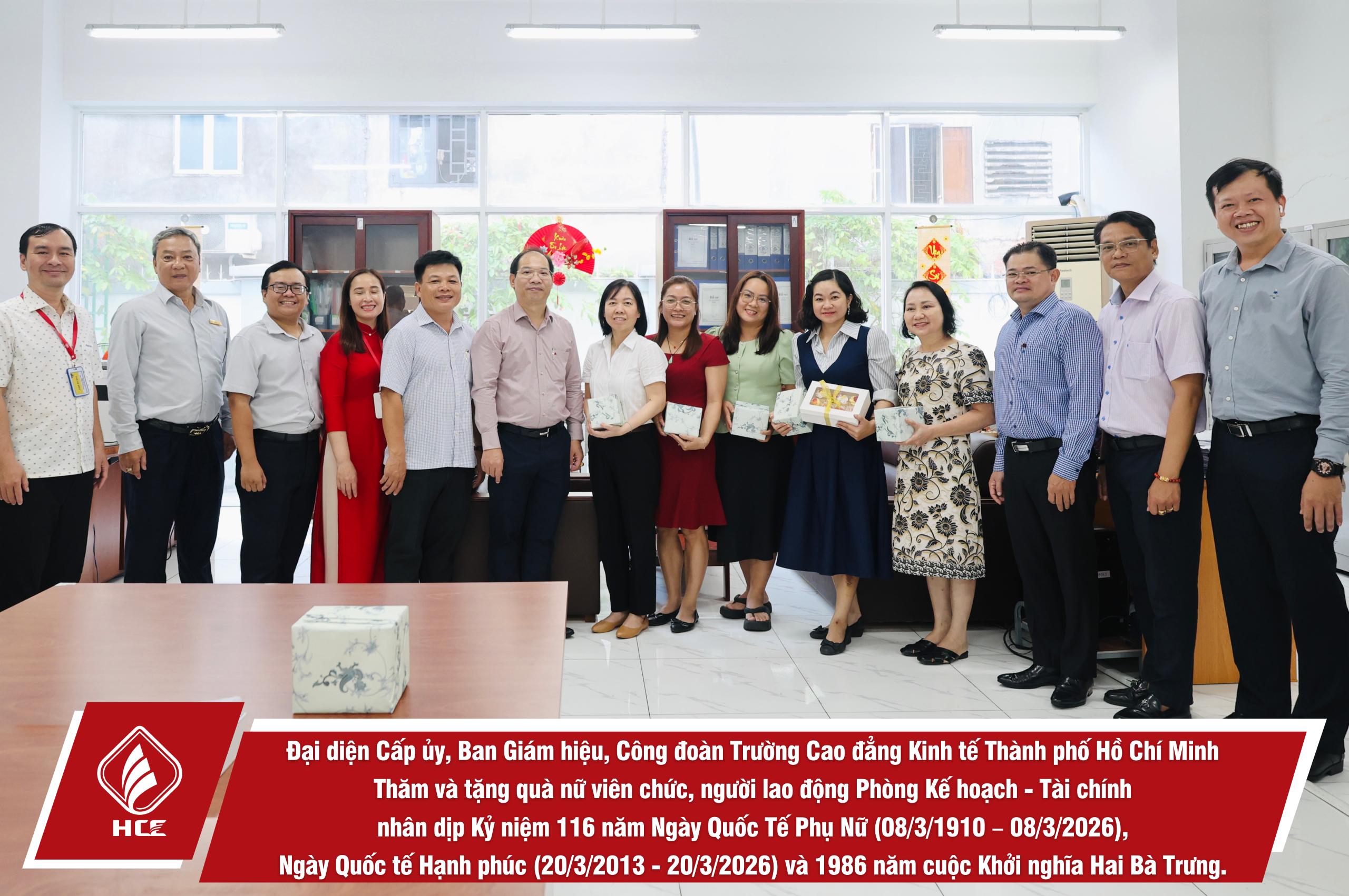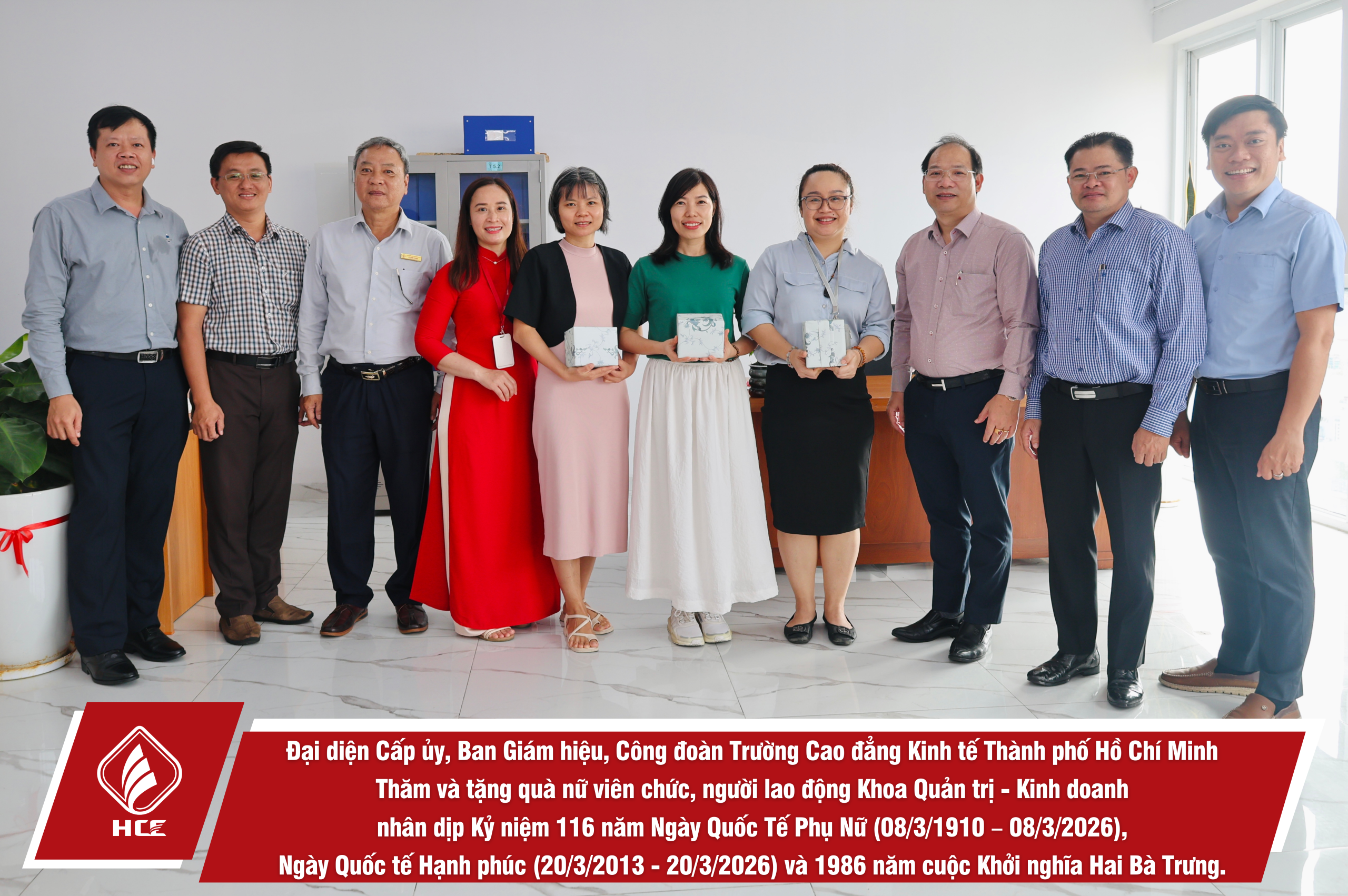Sáng ngày 04/3/2026, Đại diện Cấp ủy, Ban Giám hiệu, Ban Chấp hành Công đoàn trường Cao đẳng Kinh tế Thành phố Hồ Chí Minh (HCE) đã tổ chức Thăm và tặng quà nữ viên chức và người lao động các đơn vị trực thuộc Nhà trường nhân dịp Kỷ niệm 116 năm Ngày Quốc Tế Phụ Nữ (08/3/1910 – 08/3/2026), Ngày Quốc tế Hạnh phúc (20/3/2013 – 20/3/2026) và 1986 năm cuộc Khởi nghĩa Hai Bà Trưng.