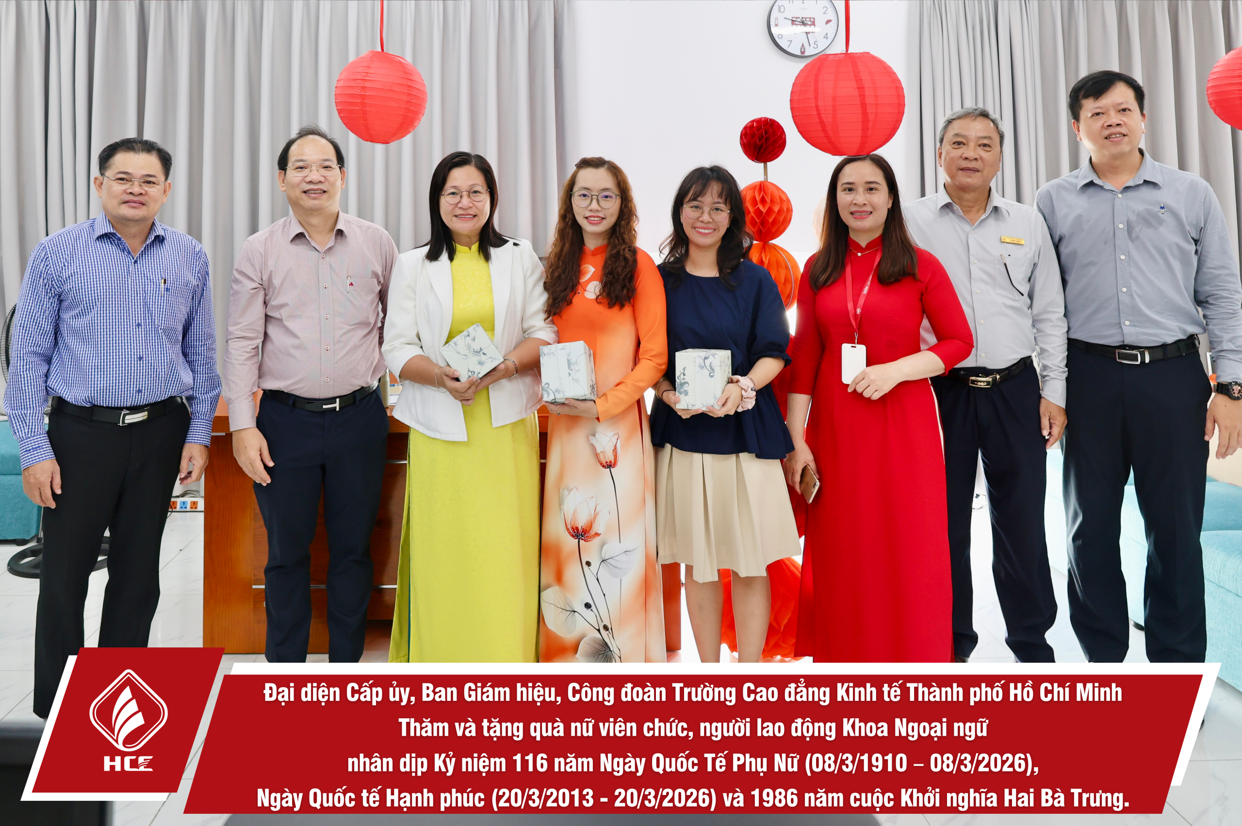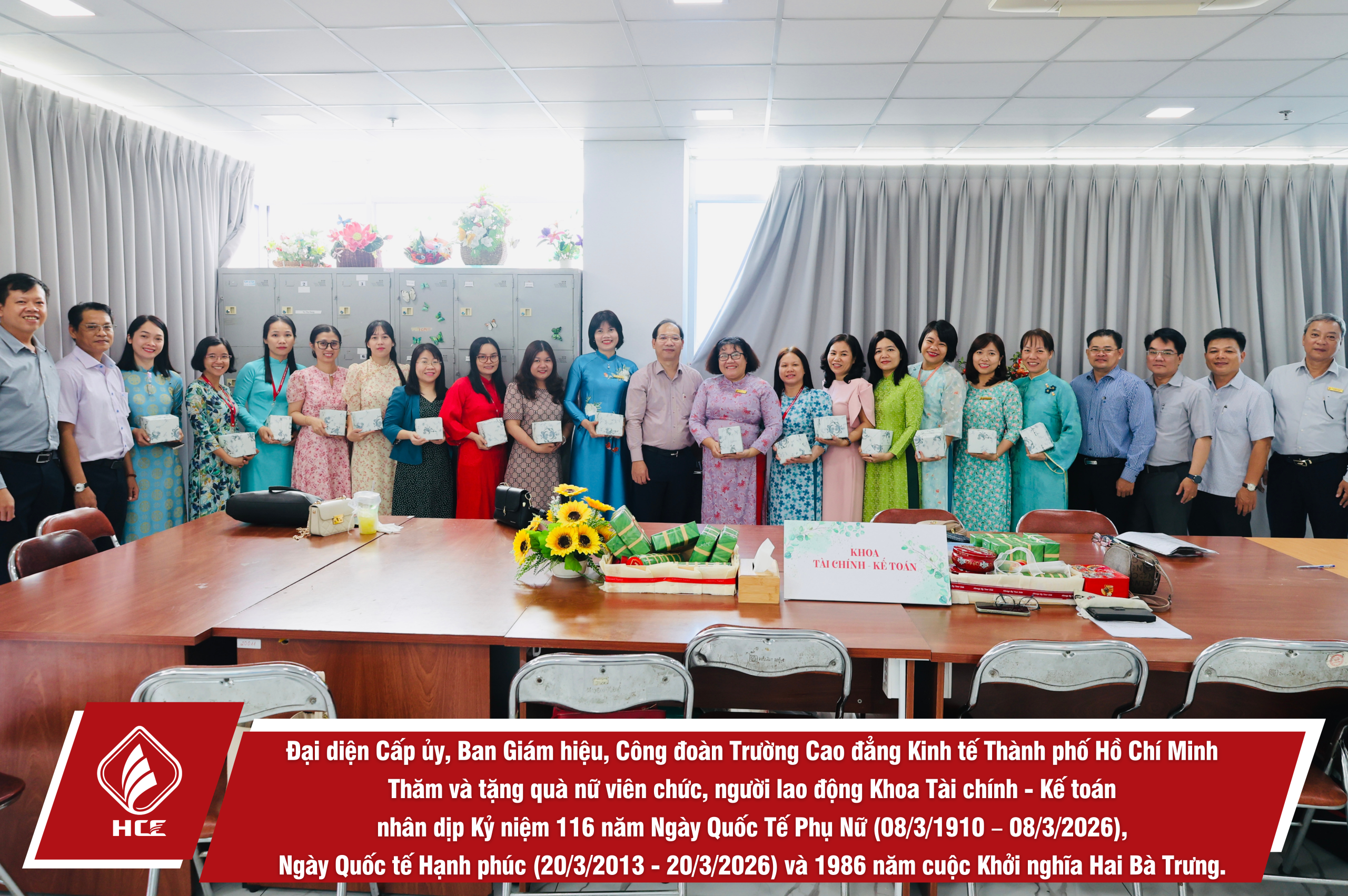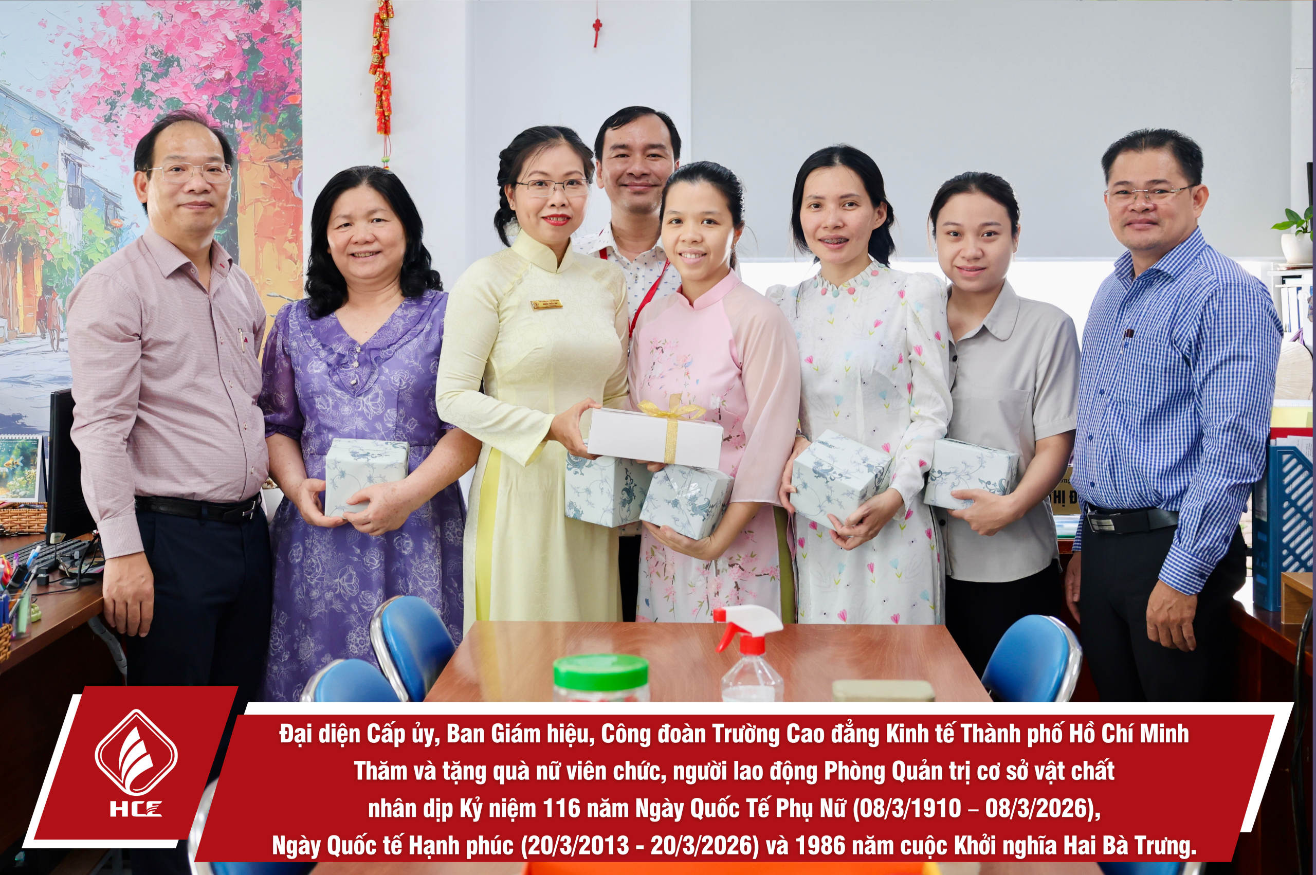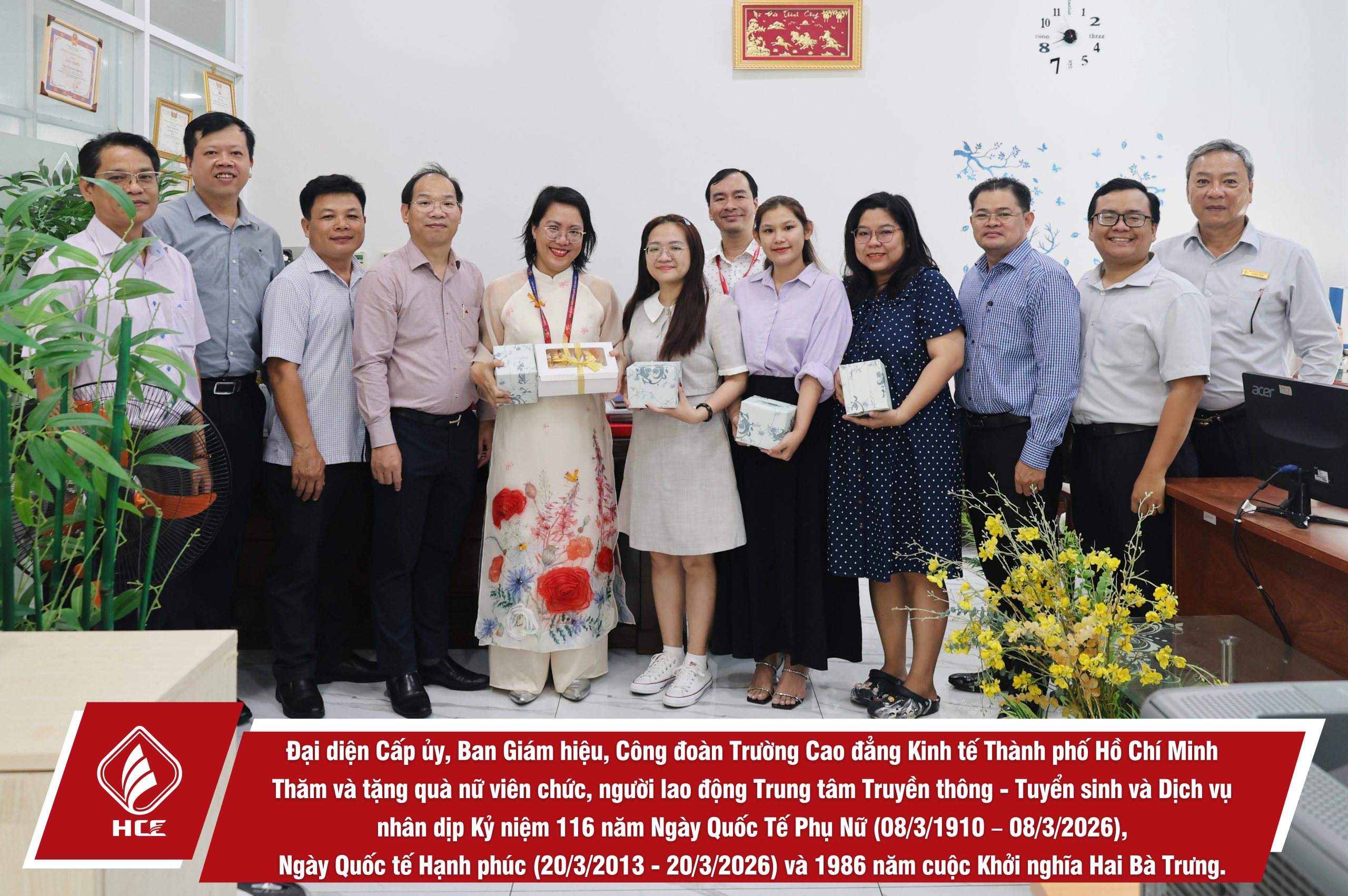 Sáng ngày 04/3/2026, Đại diện Cấp ủy, Ban Giám hiệu, Ban Chấp hành Công đoàn trường Cao đẳng Kinh tế Thành phố Hồ Chí Minh (HCE) đã tổ chức Thăm và tặng quà nữ viên chức và người lao động các đơn vị trực thuộc Nhà trường nhân dịp Kỷ niệm 116 năm Ngày Quốc Tế Phụ Nữ (08/3/1910 – 08/3/2026), Ngày Quốc tế Hạnh phúc (20/3/2013 – 20/3/2026) và 1986 năm cuộc Khởi nghĩa Hai Bà Trưng.