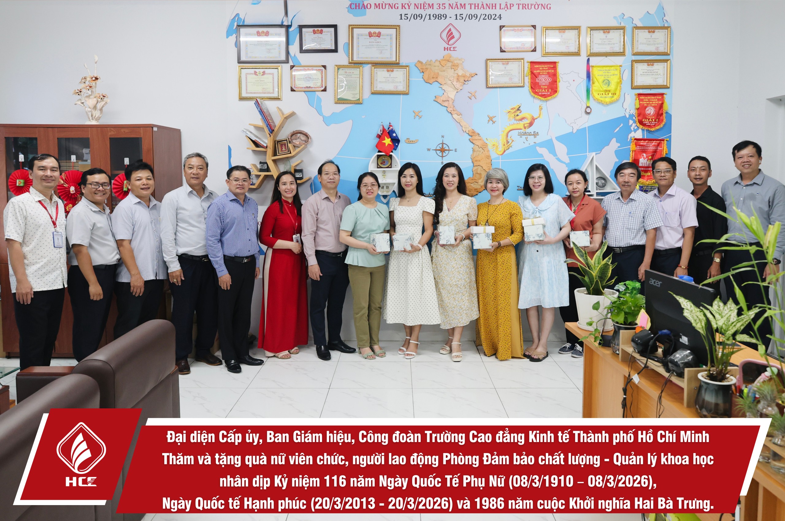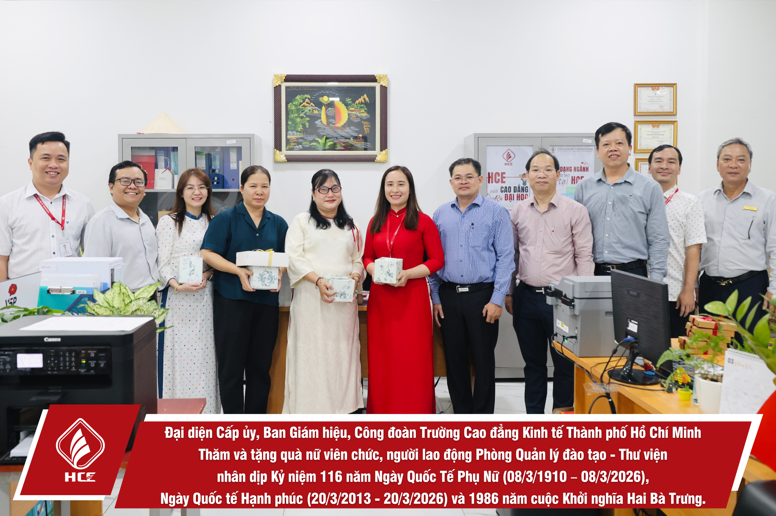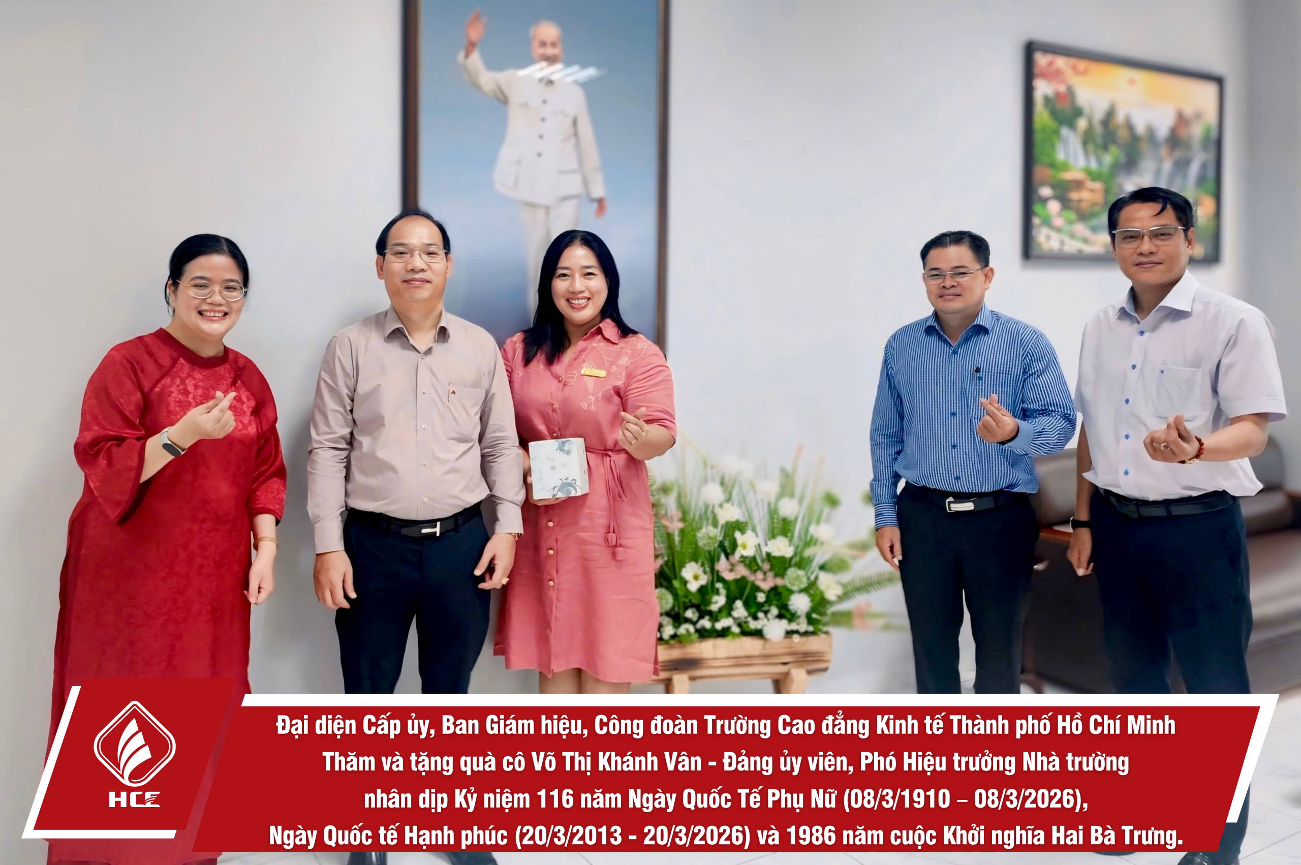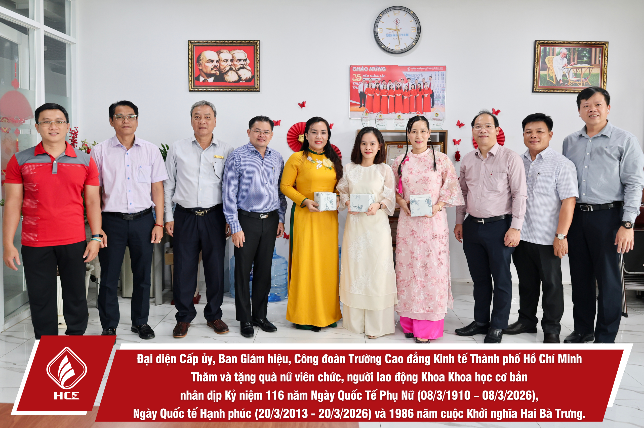 Sáng ngày 04/3/2026, Đại diện Cấp ủy, Ban Giám hiệu, Ban Chấp hành Công đoàn trường Cao đẳng Kinh tế Thành phố Hồ Chí Minh (HCE) đã tổ chức Thăm và tặng quà nữ viên chức và người lao động các đơn vị trực thuộc Nhà trường nhân dịp Kỷ niệm 116 năm Ngày Quốc Tế Phụ Nữ (08/3/1910 – 08/3/2026), Ngày Quốc tế Hạnh phúc (20/3/2013 – 20/3/2026) và 1986 năm cuộc Khởi nghĩa Hai Bà Trưng.