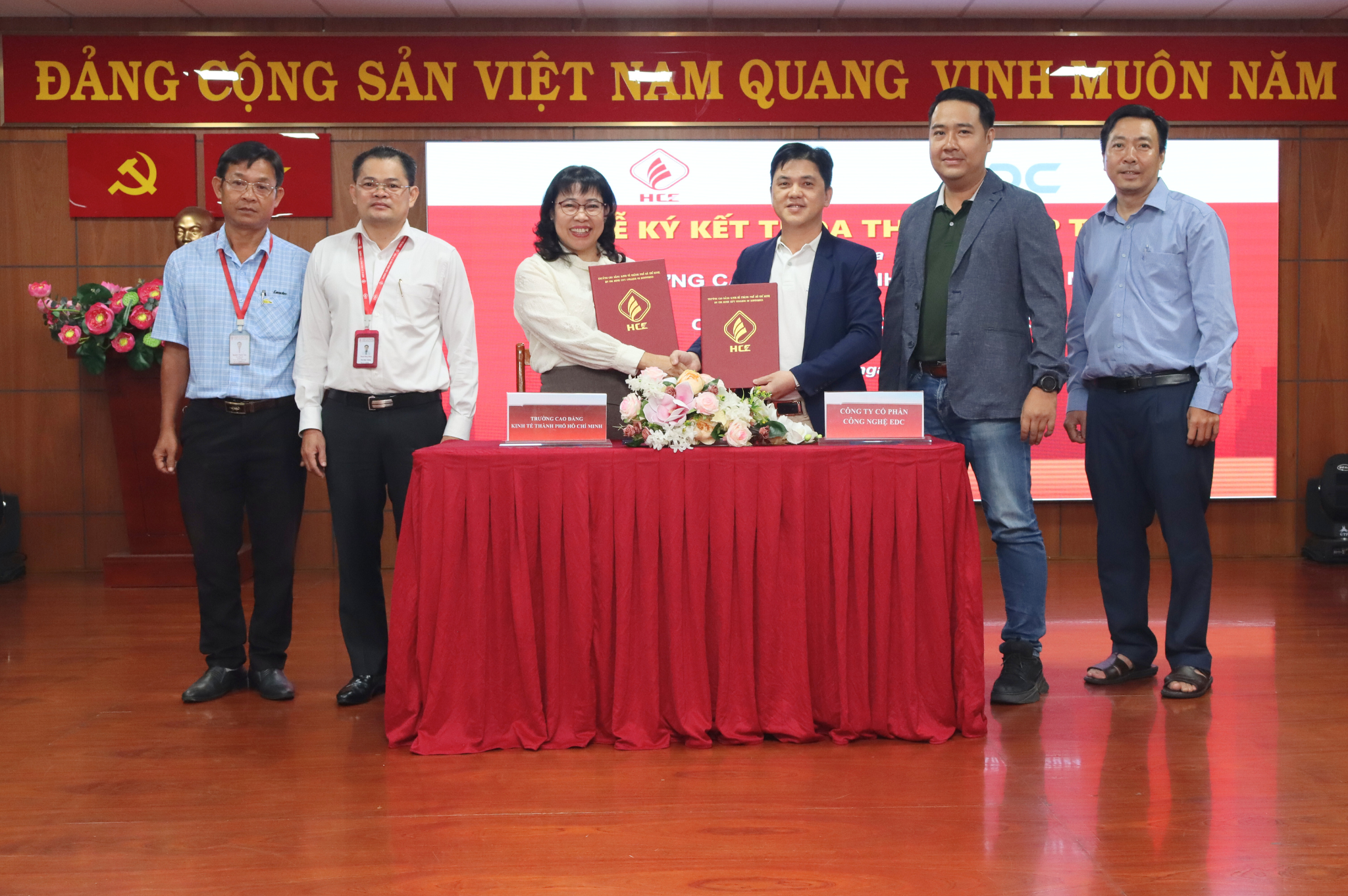 Đại diện Trường Cao đẳng Kinh tế Thành phố Hồ Chí Minh, TS. Nguyễn Đặng An Long – Uỷ viên Ban chấp hành Đảng bộ Sở Giáo dục và Đào tạo, Phó Hiệu trưởng Nhà trường ký kết hợp tác cùng Đại diện Công ty Cổ phần Công nghệ EDC Ông Vòng Lý Sáng – Tổng Giám đốc công ty