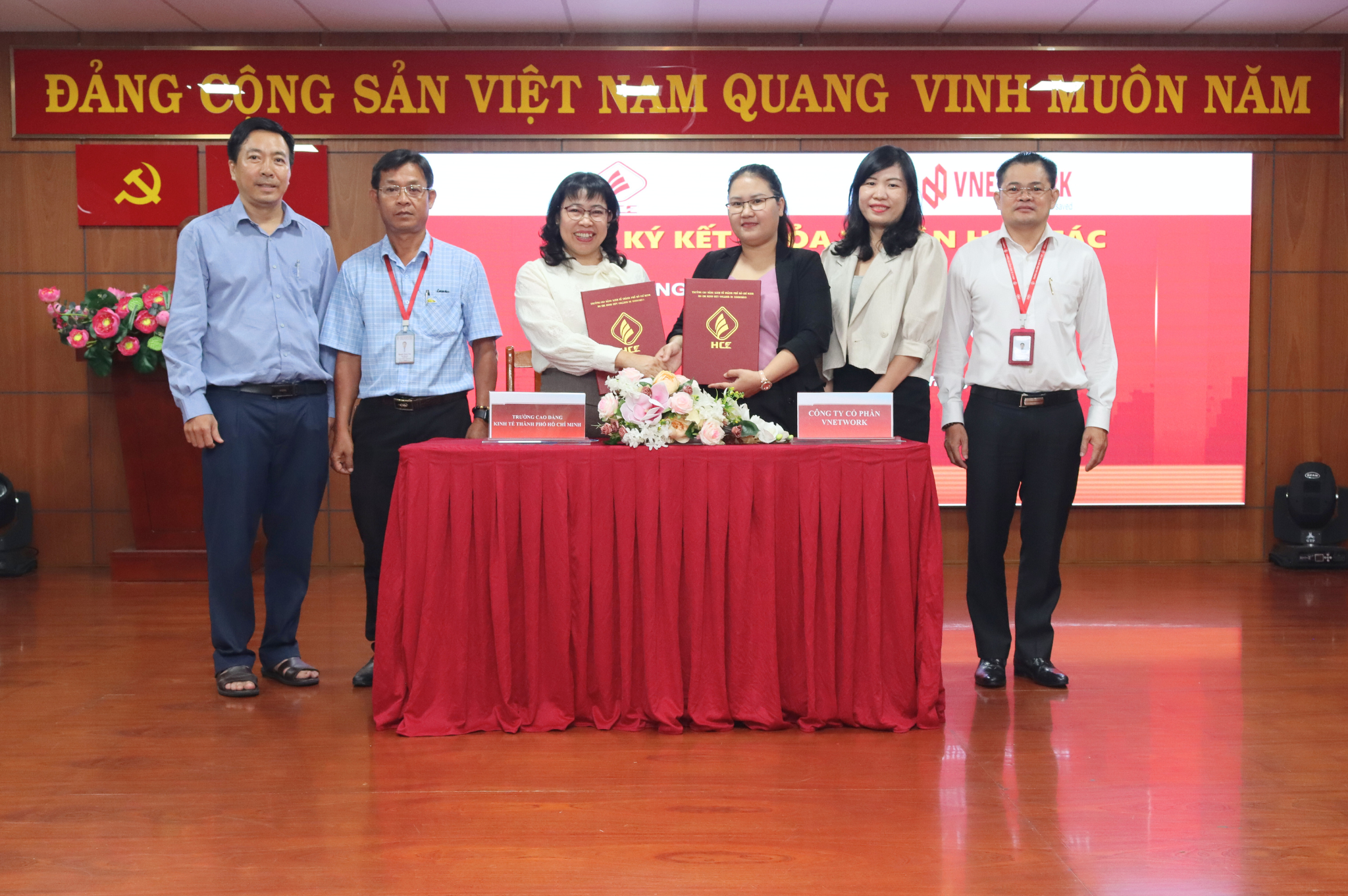 Đại diện Trường Cao đẳng Kinh tế Thành phố Hồ Chí Minh, TS. Nguyễn Đặng An Long – Uỷ viên Ban chấp hành Đảng bộ Sở Giáo dục và Đào tạo, Phó Hiệu trưởng Nhà trường ký kết hợp tác cùng Đại diện Công ty Cổ phần Vnetwork Bà Nguyễn Thị Hoàng Thi – Phó Giám đốc vận hành