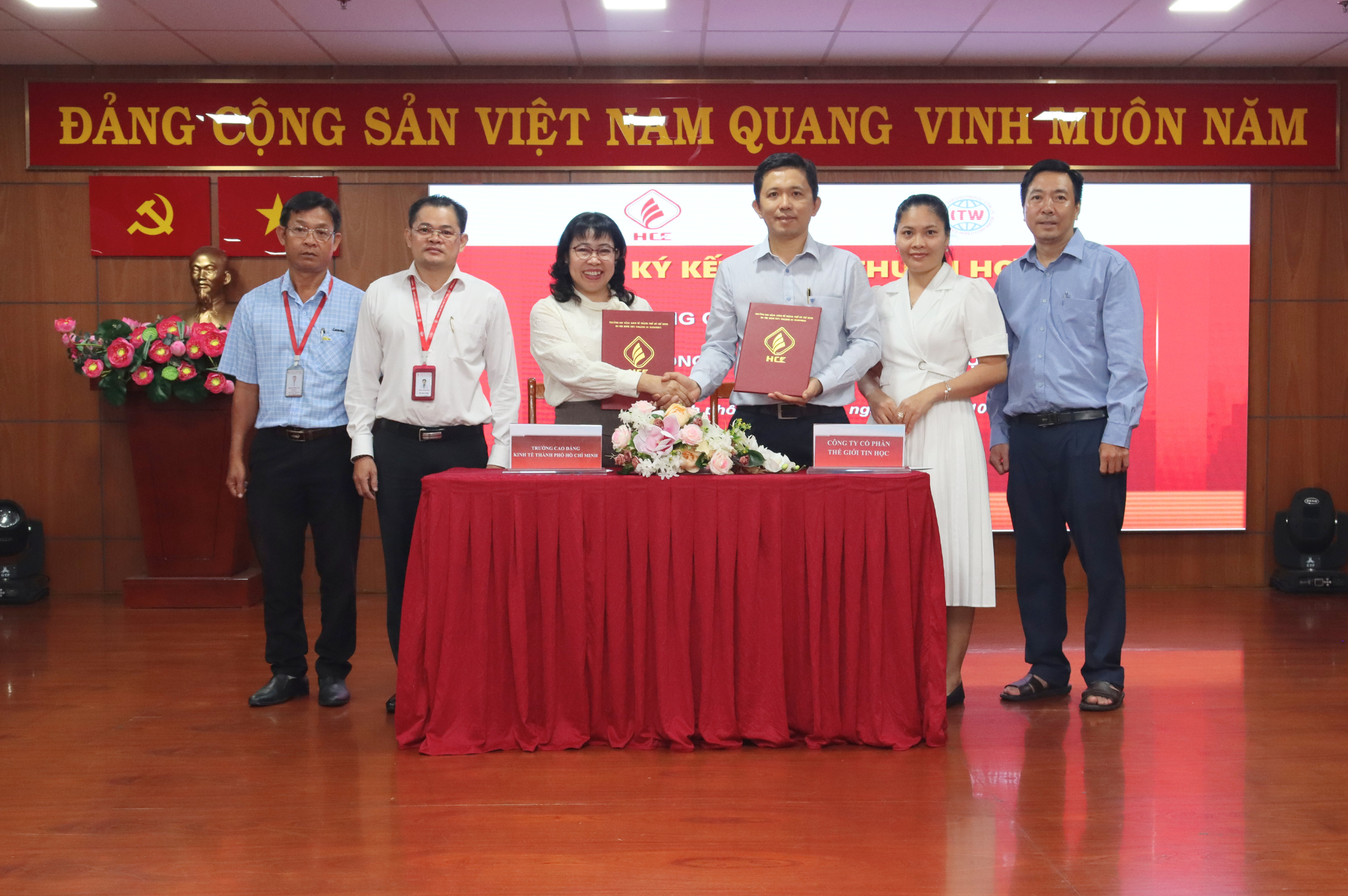 Đại diện Trường Cao đẳng Kinh tế Thành phố Hồ Chí Minh, TS. Nguyễn Đặng An Long – Uỷ viên Ban chấp hành Đảng bộ Sở Giáo dục và Đào tạo, Phó Hiệu trưởng Nhà trường ký kết hợp tác cùng Đại diện Công ty Cổ phần Thế giới Tin học Ông Lê Quang Khải – Giám đốc công ty