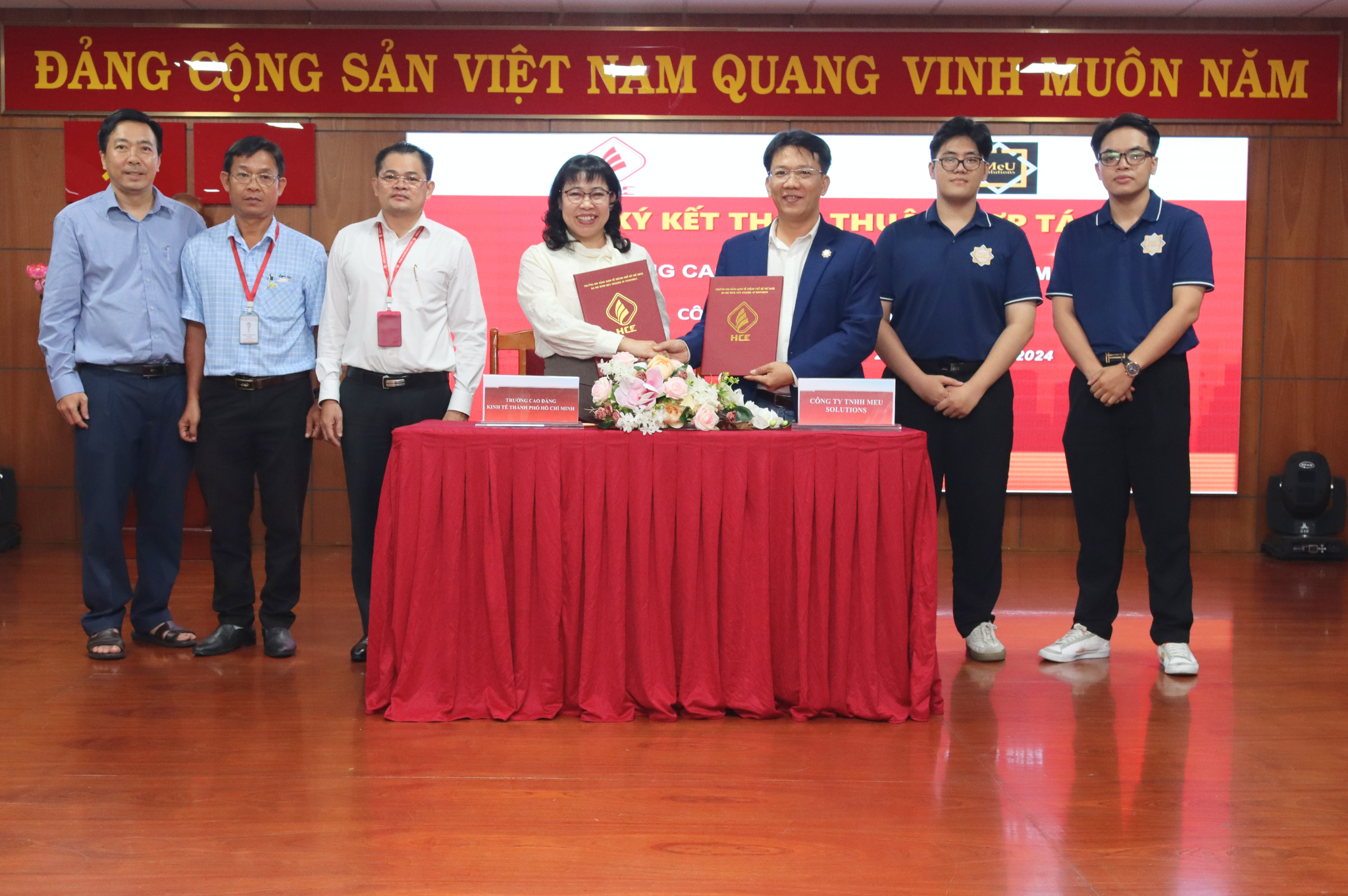 Đại diện Trường Cao đẳng Kinh tế Thành phố Hồ Chí Minh, TS. Nguyễn Đặng An Long – Uỷ viên Ban chấp hành Đảng bộ Sở Giáo dục và Đào tạo, Phó Hiệu trưởng Nhà trường ký kết hợp tác cùng Đại diện Công ty TNHH Meu Solutions, Ông Trần Thanh Tuyền – Giám đốc công ty