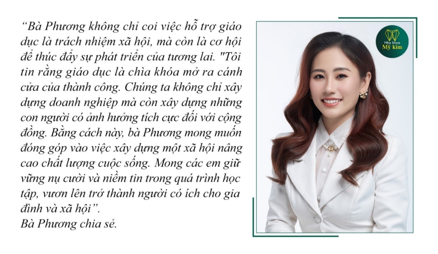 Theo như dự kiến, CEO Phan Thị Kiều Phương – Nhà sáng lập thương hiệu Nha Khoa Mỹ Kim và Cộng sự sẽ đồng hành và trao tặng 05 triệu đồng gồm 5 suất học bổng, mỗi suất trị giá 01 triệu đồng.