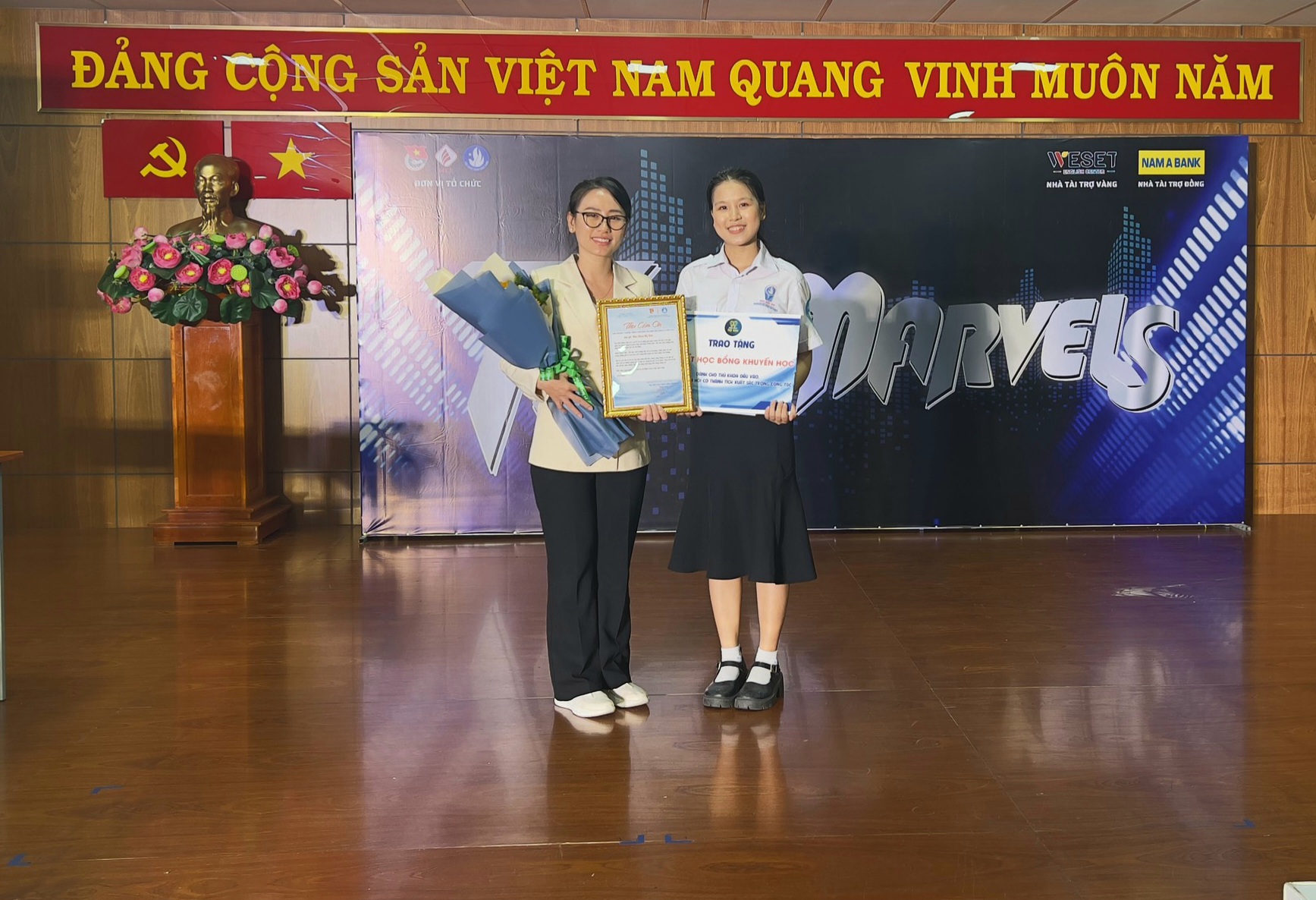 Đồng chí Nguyễn Thị Phương Nguyên, Phó Chủ tịch Hội Sinh viên Trường nhận bảng trao học bổng tượng trưng từ phía Nhà hảo tâm
