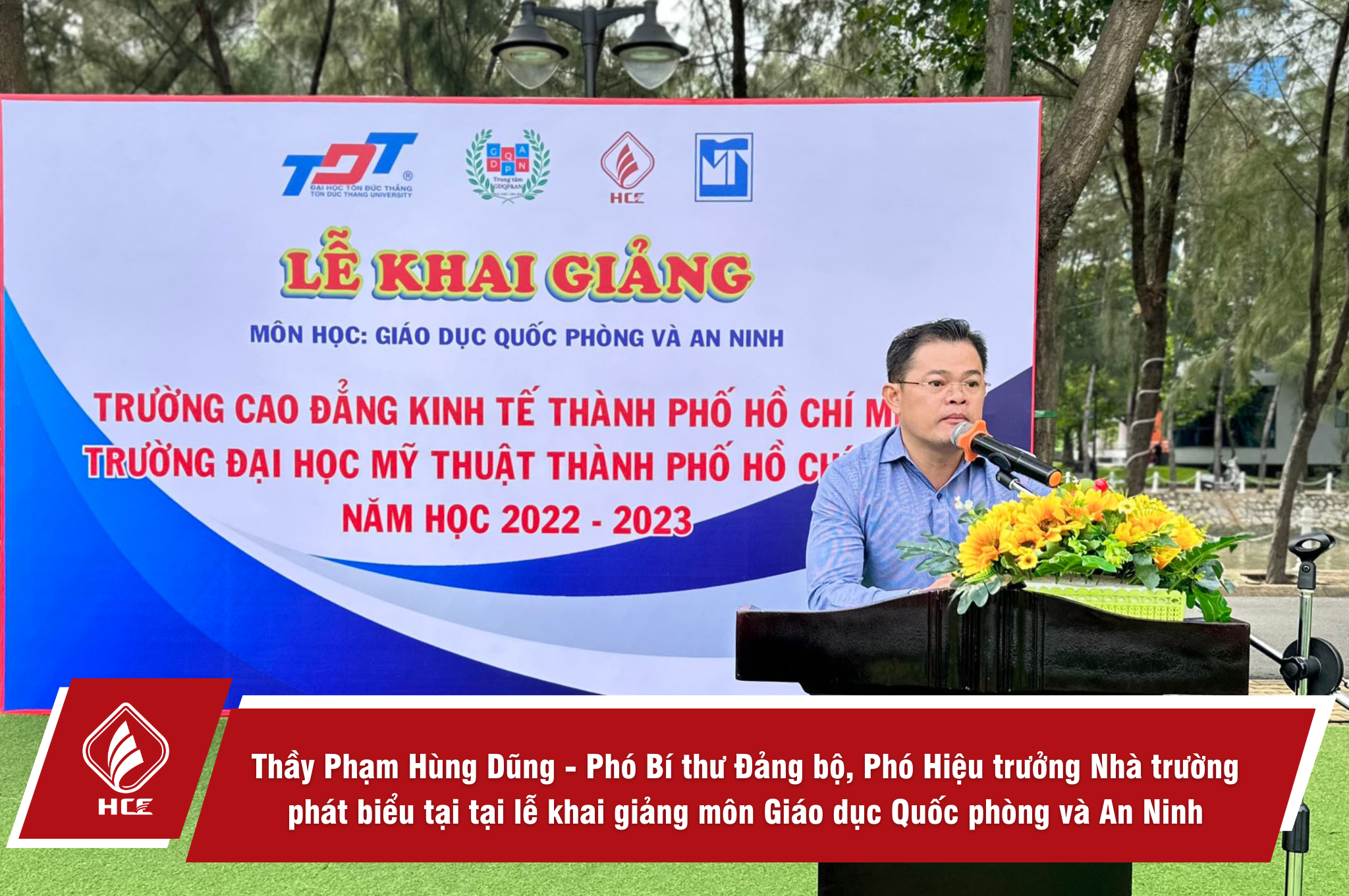 Sáng ngày 04/7/2023, Trường Cao đẳng Kinh Tế thành phố Hồ Chí Minh (HCE) đã phối hợp với Trung tâm Giáo dục Quốc phòng và An ninh (QPAN) của Trường Đại học Tôn Đức Thắng đã tổ chức khai giảng môn học Giáo dục Quốc phòng và An ninh tại cơ sở của Trường Đại học Tôn Đức Thắng (số 19 đường Nguyễn Hữu Thọ, phường Tân Hưng, Quận 7).