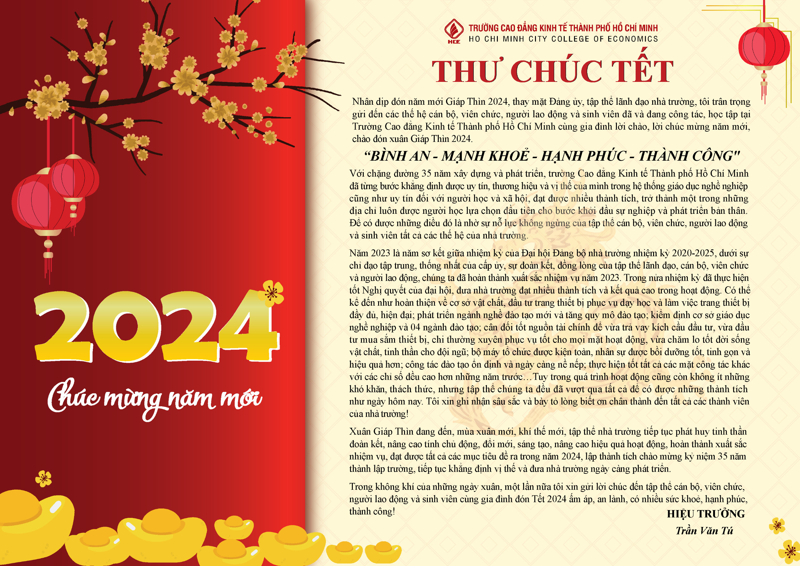 Nhân dịp đón năm mới Giáp Thìn 2024, thay mặt Đảng ủy, tập thể lãnh đạo nhà trường, tôi trân trọng gửi đến các thế hệ cán bộ, viên chức, người lao động và sinh viên đã và đang công tác, học tập tại Trường Cao đẳng Kinh tế Thành phố Hồ Chí Minh cùng gia đình lời chào, lời chúc mừng năm mới, chào đón xuân Giáp Thìn 2024: