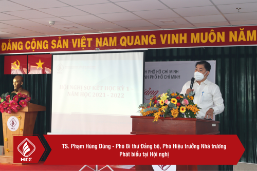 Phát biểu kết luận Hội nghị, TS. Phạm Hùng Dũng – Phó Bí thư Đảng bộ, Phó Hiệu trưởng Nhà trường đánh giá cao và tuyên dương những nỗ lực của toàn thể đội ngũ giảng viên, nhân viên Nhà trường trong học kì I, thống nhất ý kiến với báo cáo sơ kết học kỳ I. Đồng thời, Thầy cũng ghi nhận và động viên toàn thể Nhà trường tiếp tục cố gắng duy trì tốt và phát huy những mặt đạt được trong học kì vừa qua, thực hiện cụ thể hóa các giải pháp giải quyết mặt còn hạn chế, góp phần xây dựng nhiều thành tích cho năm học 2021 – 2022.
