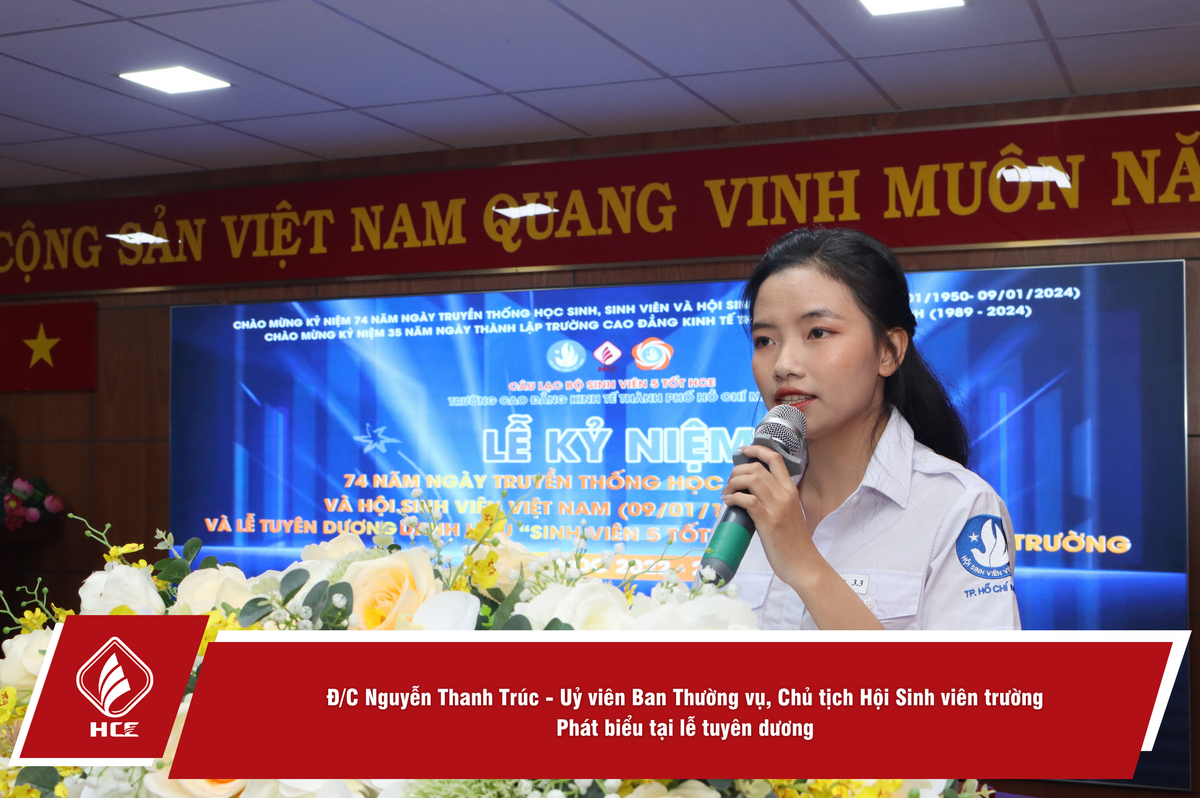 Phát biểu tại lễ tuyên dương, Nguyễn Thanh Trúc – Chủ tịch Hội sinh viên trường nhiệt liệt biểu dương những kết quả mà Hội Sinh viên HCE đã đạt được trong năm học 2022 – 2023, đồng thời gửi lời chúc mừng tới tất cả các bạn sinh viên đã vinh dự được nhận danh hiệu “Sinh viên 5 tốt” cấp trường và cấp thành phố – những nhân tố xuất sắc đạt đủ 5 tiêu chí: Đạo đức tốt – Học tập tốt – Thể lực tốt – Tình nguyện tốt – Hội nhập tốt.