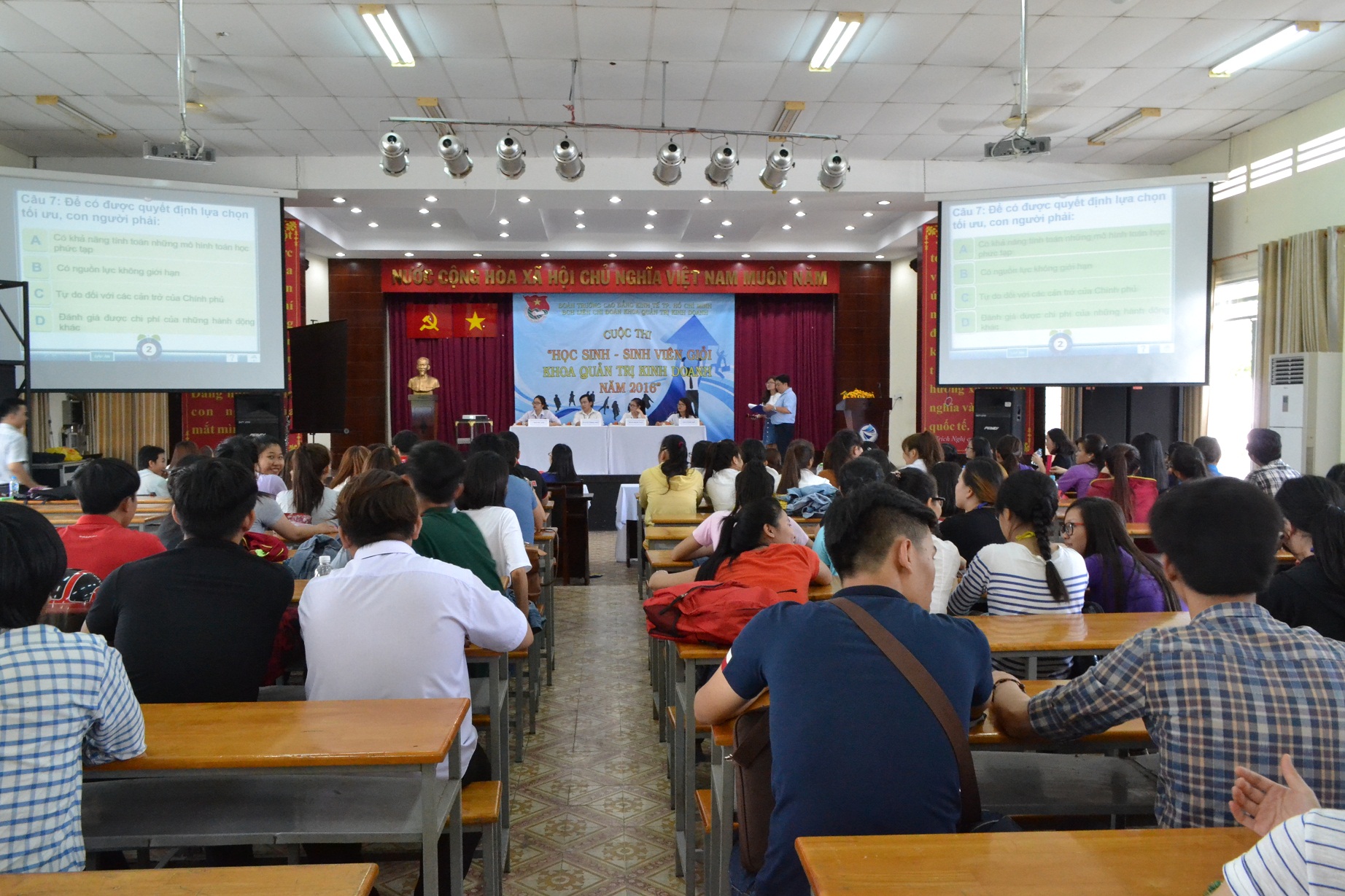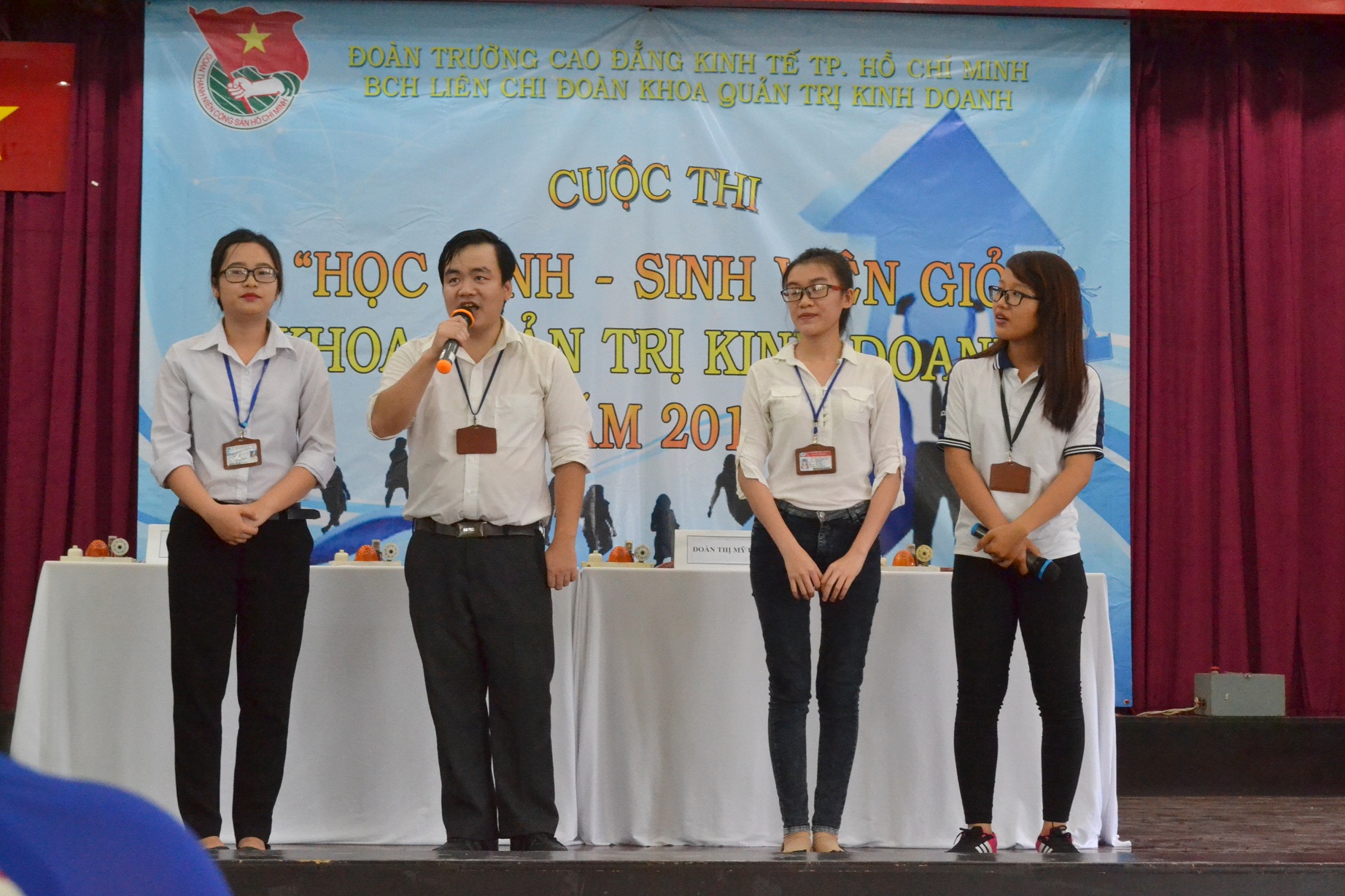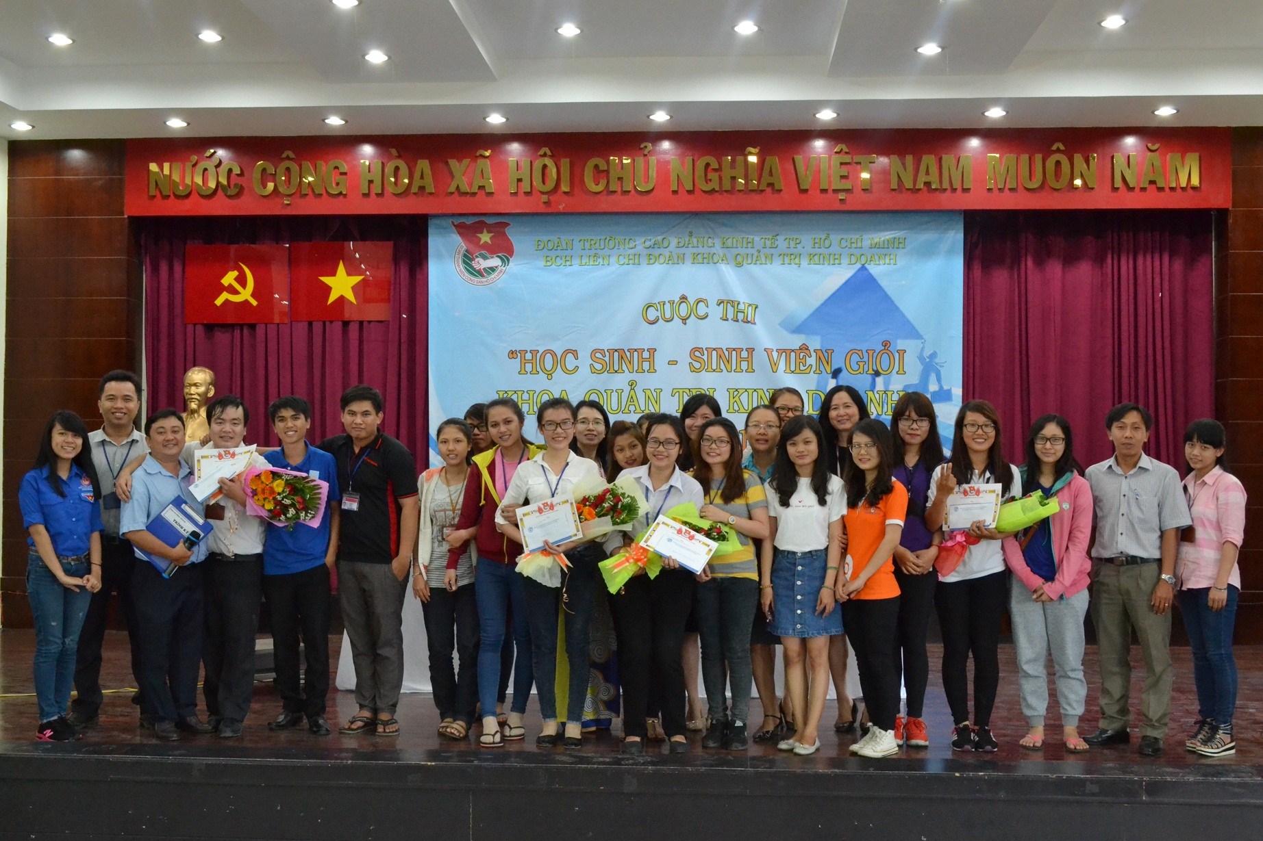 Thực hiện theo kế hoạch năm học 2015 – 2016 của Khoa Quản Trị Kinh Doanh, ngày 9 tháng 4 năm 2016 được sự cho phép của Nhà trường, Khoa Quản Trị Kinh Doanh đã tiến hành tổ chức vòng chung kết cuộc thi “Học sinh – Sinh viên giỏi Khoa Quản Trị Kinh Doanh năm 2016”. Đến tham dự vòng chung kết cuộc thi, về phía khách mời có sự tham dự của cô Nguyễn Khoa Hồng Minh – Trưởng khoa Ngoại Ngữ. Về phía Khoa Quản Trị Kinh Doanh có sự tham dự của: Cô Tăng Thị Bích Hằng – Trưởng khoa; Cô Nguyễn Thị Trúc Phương – Phó trưởng khoa, cùng các thầy cô là giảng viên/nhân viên Khoa QTKD và hơn 100 HSSV tham gia cổ vũ cho cuộc thi.